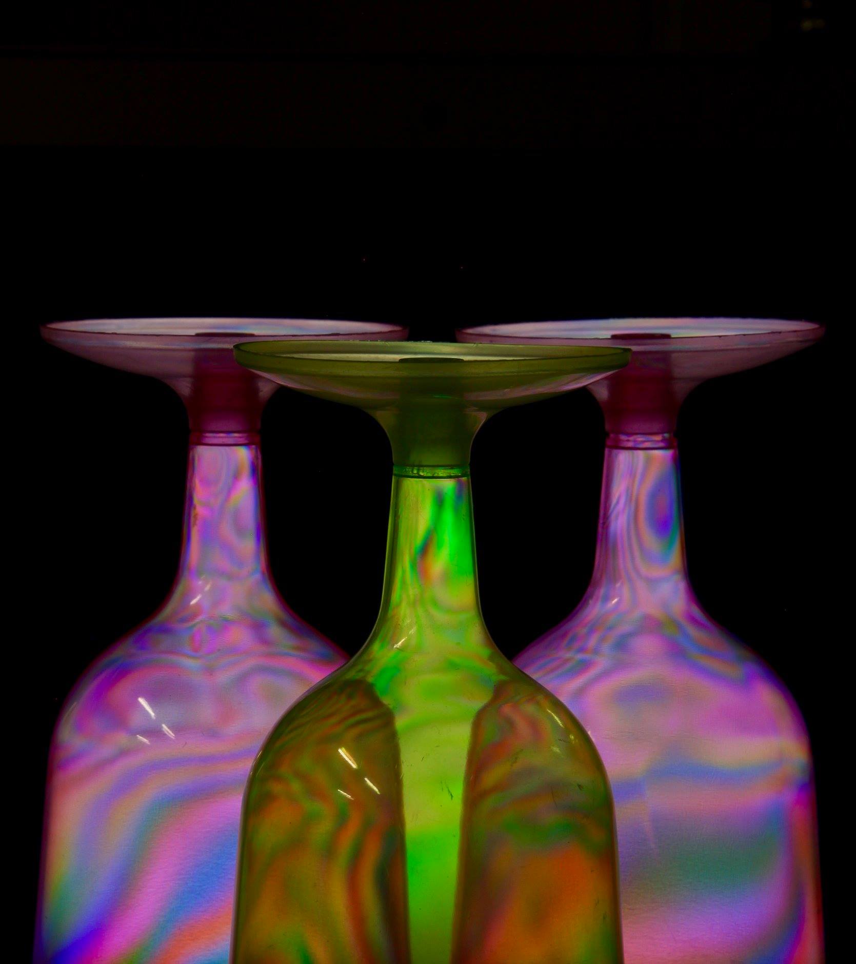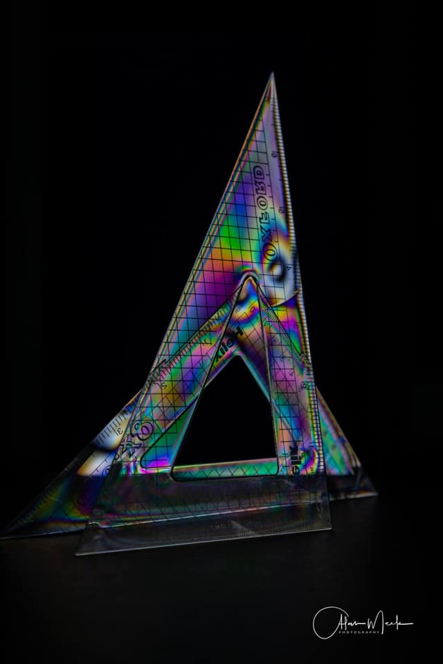 At the top our light source (the Led’s in the laptop screen). Then the polarising filter (the Liquid Cristal Display), at the bottom the polarising filter on the camera rotated by 90 degrees so the screen appear dark.If we then put a transparent object in front of the screen that has some degree of polarising capability (because of internal stress or molecular structure) the polarised light gets rotated and not blocked anymore by the polarising filter on the camera. Clear plastic things like cups, cutlery, CD case, safety specs all do this to varying degrees, as you can see from the images captured on the night. The different colours are related to the thickness and the stress in the plastic, the light gets rotated more when the plastic is thicker, as it has to travel a longer path.