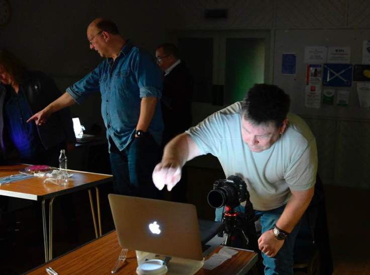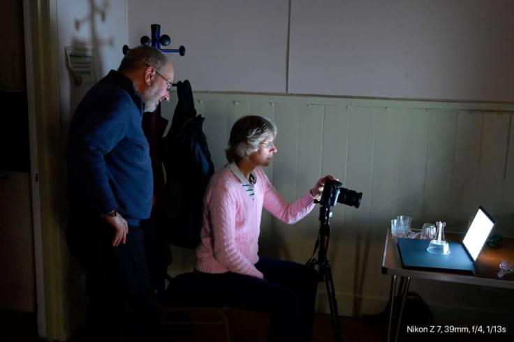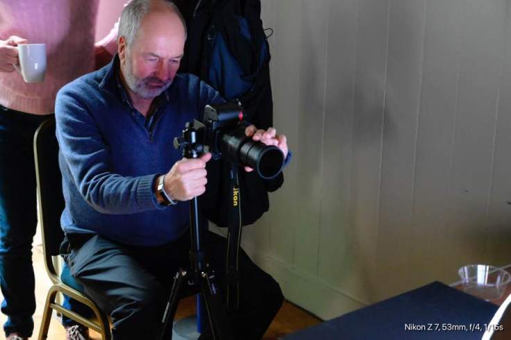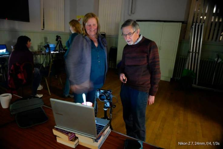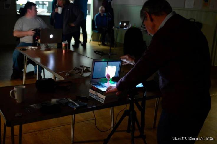 Trevor fine tuning his set up. You can see that the screen is dark but the plastic cup is bright, as I took this shot with a polarising filter on my camera.