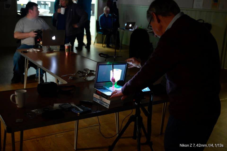 This image by Alan Meek shows that the laptop screen appears black, because he has his polarising filter at 90 degrees to the light emitted by the laptop screen. The forks rotate the light a bit so some of it is not blocked by the filter.A few images of club members in action, we had to turn the lights off in the room to avoid reflections and spoiling the colours, hence it was a bit dark apart from the laptops lighting up the room.