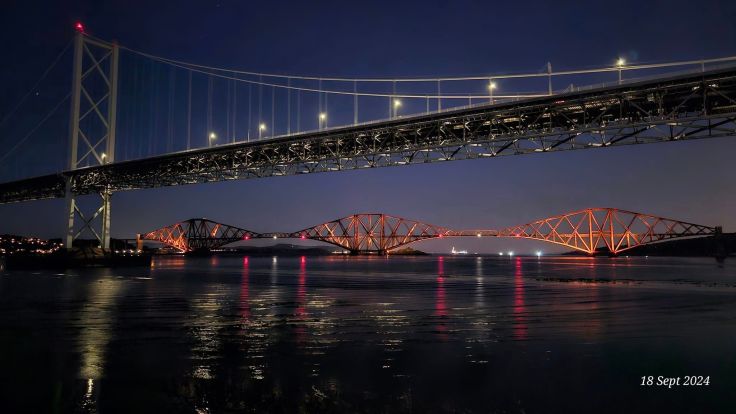 Road and Railway Bridges over the Forth – by Bob Taylor. Nice colour contrast of the blue hour sky and the iconic red of the railway bridge.
