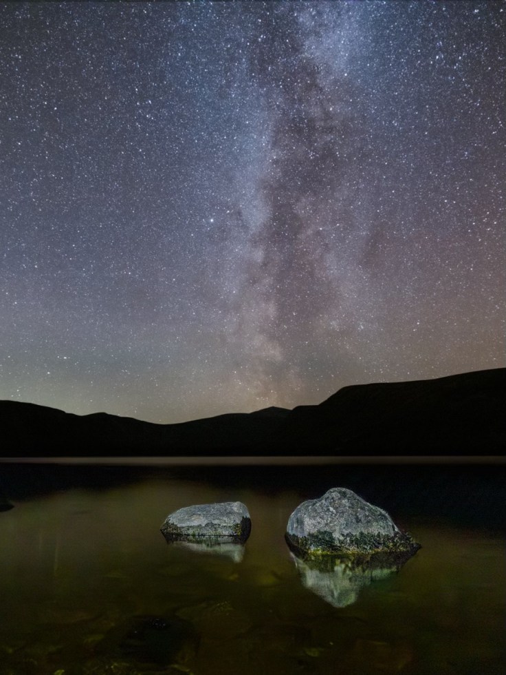 Rocks in the Loch – Dave Lynch. Dave also took a few shots using his astro rotator. This device mounts on the tripod, carefully aligned with the earth axis by pointing it at the north star. It then rotates in the opposite direction of the earth itself, keeping the camera aligned with the stars. You can then take much longer exposures, get less noise and better colours. The drawback is that the foreground now moves relative to the camera and gets blurred.