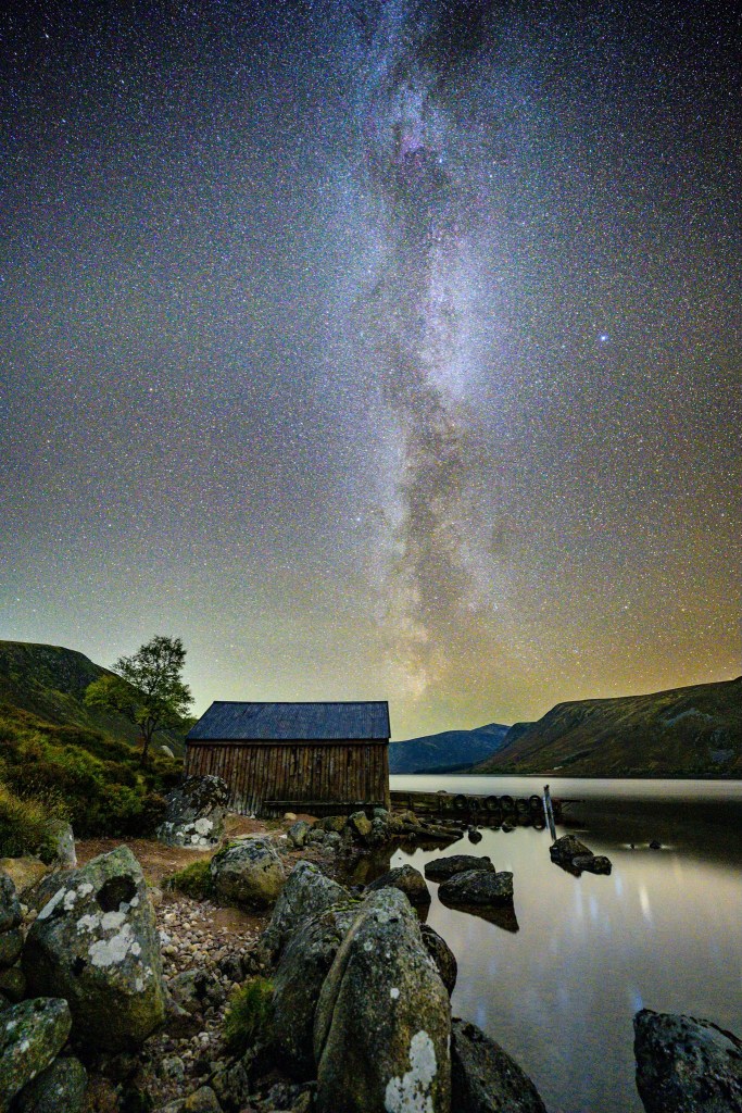 Dave had planned the location so we would have the boat house in the foreground with the Milky Way behind it. A bit of scramble on the steep bank to the loch. Bog and rocks made it hard to find a place to put your feet. This is where the spiked feet on my tripod proved really useful, used as a three legged walking stick.