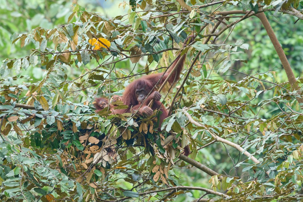 Borneo—Orang-utan. This may not be the best of photos as the light was not good but an amazing opportunity to see and photograph a mother and baby orang-utan in the wild. They were just settling down in the nest Mum had made for the night.
