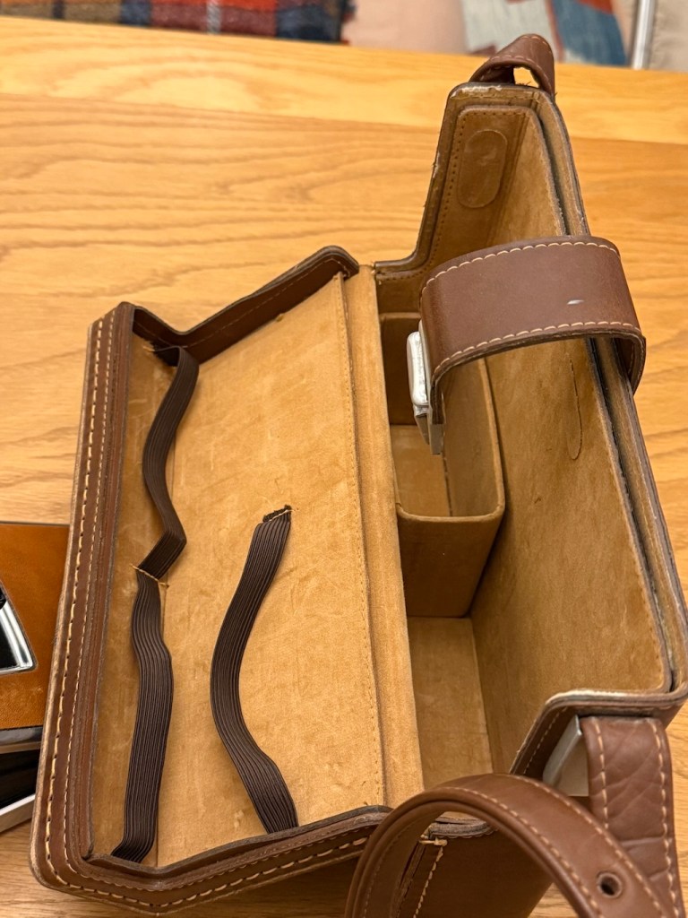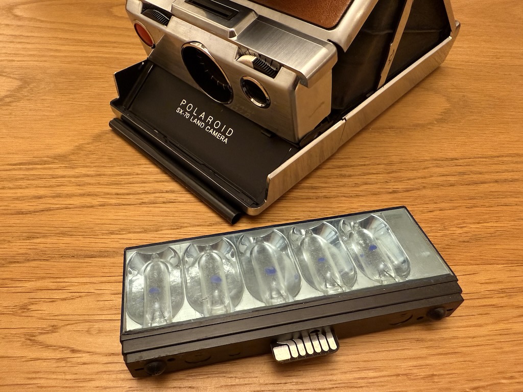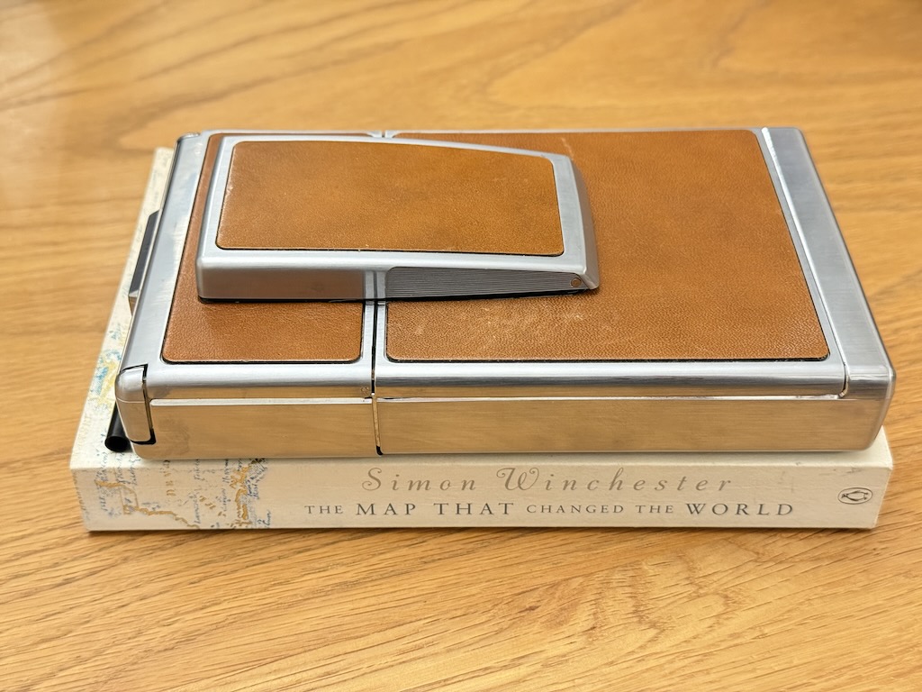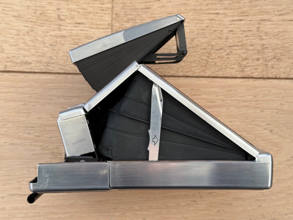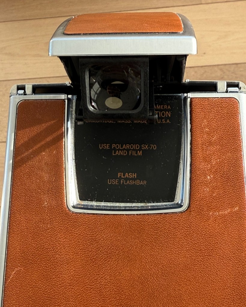 The Polaroid SX70 I inherited from my uncle, still working after 50 plus years. The size of the mirror means that there is a fairly loud wallop when it flips up to expose the film, followed by the motor ejecting the print out the front.