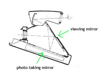 Internal optical path of the SX70. The photo-taking mirror flips up to project the image onto the film.