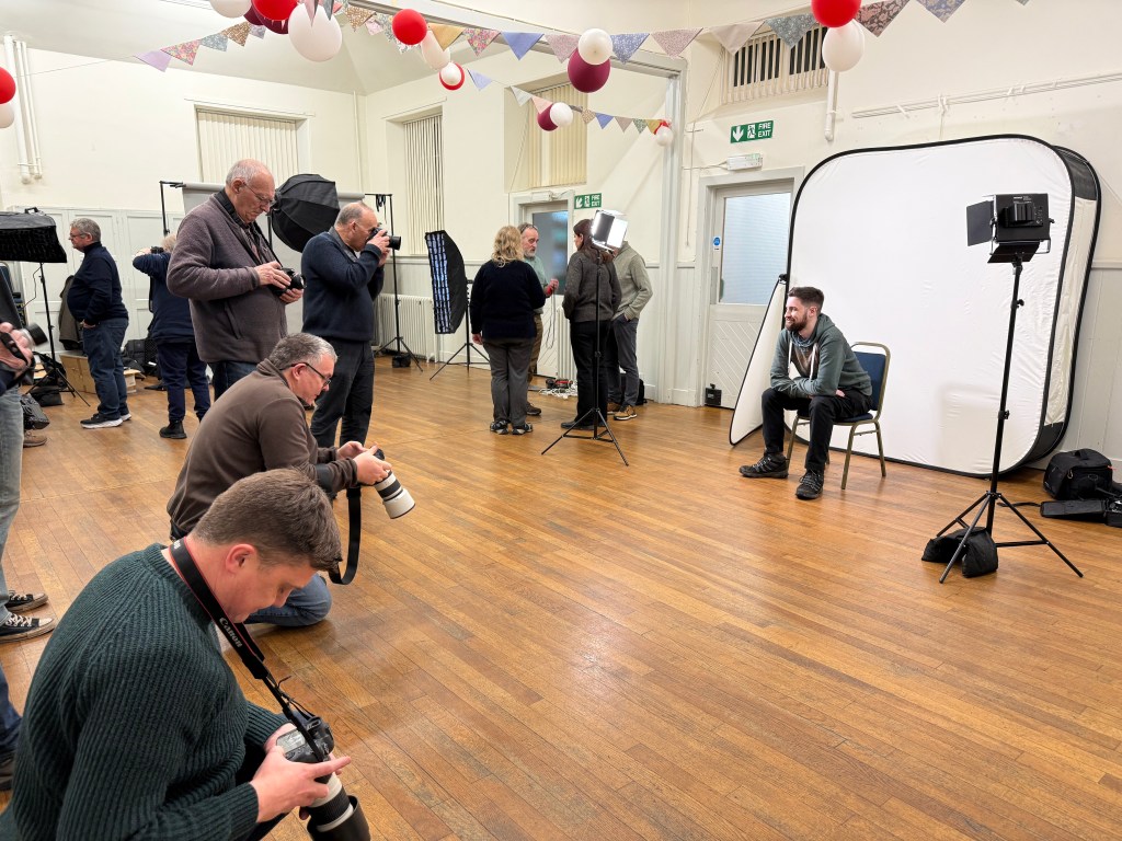 LED lighting setup with a patient club member posing, and the flash set ups at the back of the hall.